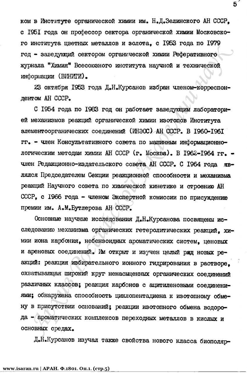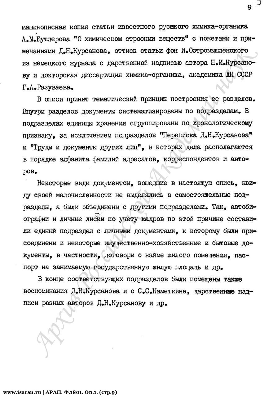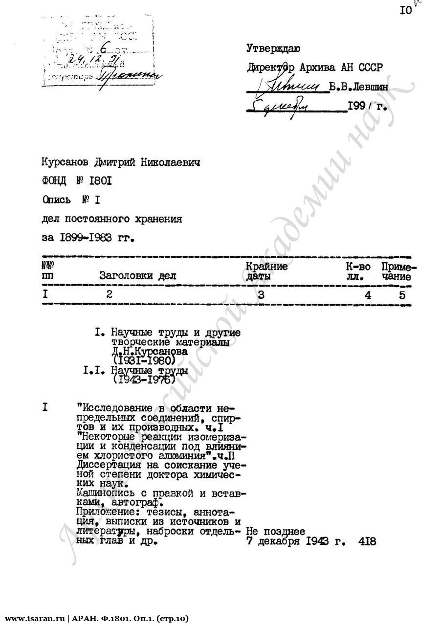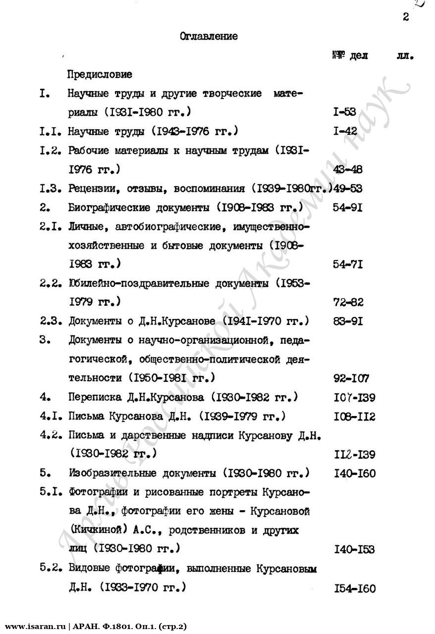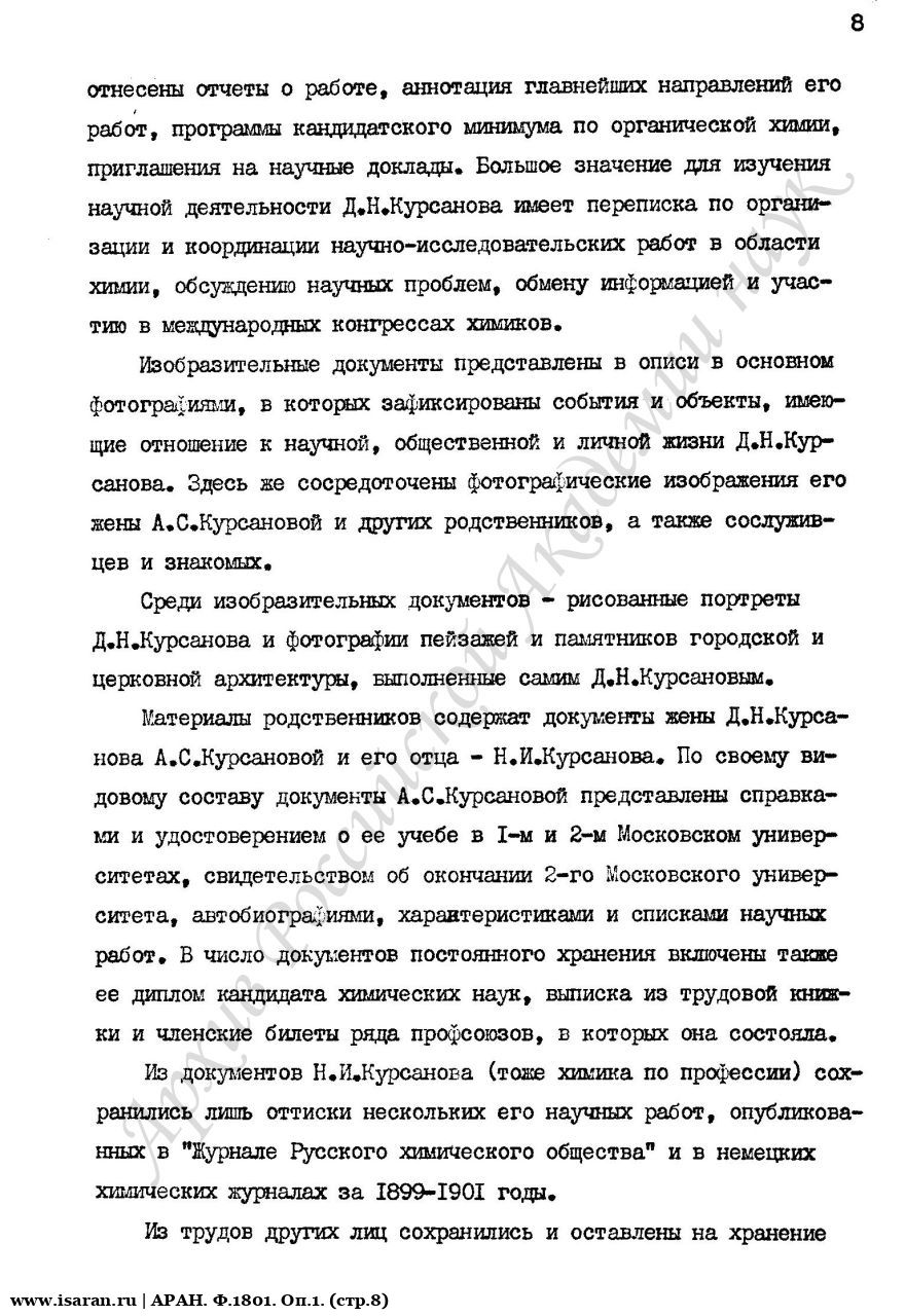 Научные труды, биографические документы, документы родственников (отца и жены), документы по деятельности, переписка, труды других лиц, фотографии и рисованные портреты Курсанова Д.Н.