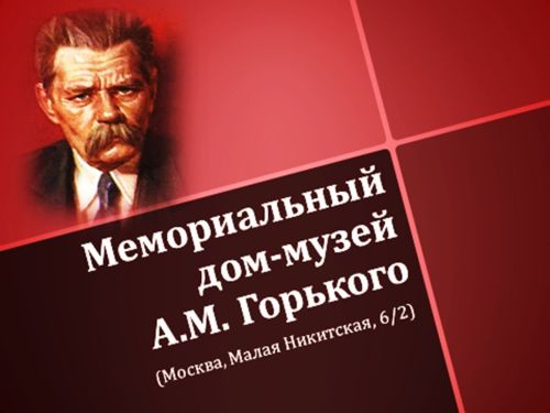 Музей А.М. Горького - академический литературный монографический музей. Создан при Институте мировой литературы Постановлением Президиума ЦИК Союза ССР от 14 февраля 1937 года. 1 ноября 1937 г. Музей принял первых посетителей. Первым директором Музея был секретарь А.М. Горького - П.П. Крючков. Научное руководство осуществлял директор Института И.К. Луппол. Музей возглавляли С.В. Туманов (1938-1941), Л.И. Пономарев (1946-1961), М.Б. Козьмин (1962-1975), Л.П. Быковцева (1975-2001), И.Ф. Еремина (2001-2002), с 2002 г. – С.М. Демкина.